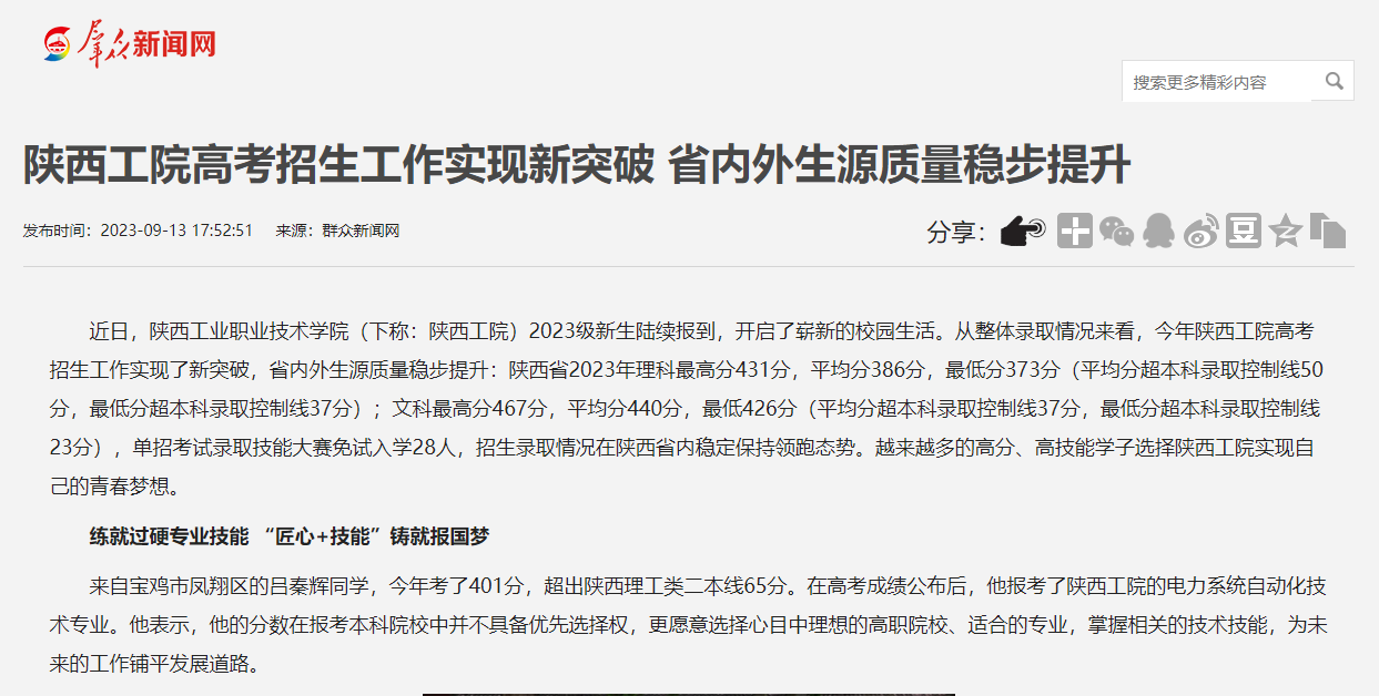 原载于群众华体会(中国)网《陕西工院高考招生工作实现新突破 省内外生源质量稳步提升》
