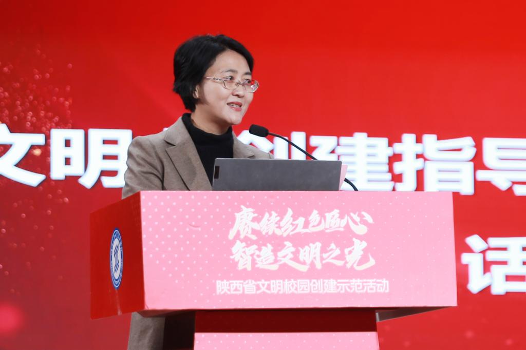 省委文明办创建处处长贺聪梅表示,文明校园创建是以习近平新时代中国特色社会主义思想铸魂育人和落实立德树人根本任务的重要实践,是群众性精神文明创建活动的重要组成部分。希望全省各高校能在习近平文化思想的指引下,立足陕西富集的红色资源,深入挖掘红色精神的丰富内涵和时代价值,把弘扬红色精神与推进育人工作有机结合起来,以红色精神培育时代新人、让红色基因代代相传,努力把文明校园创建示范活动办出特色、办出亮点、办出水平。