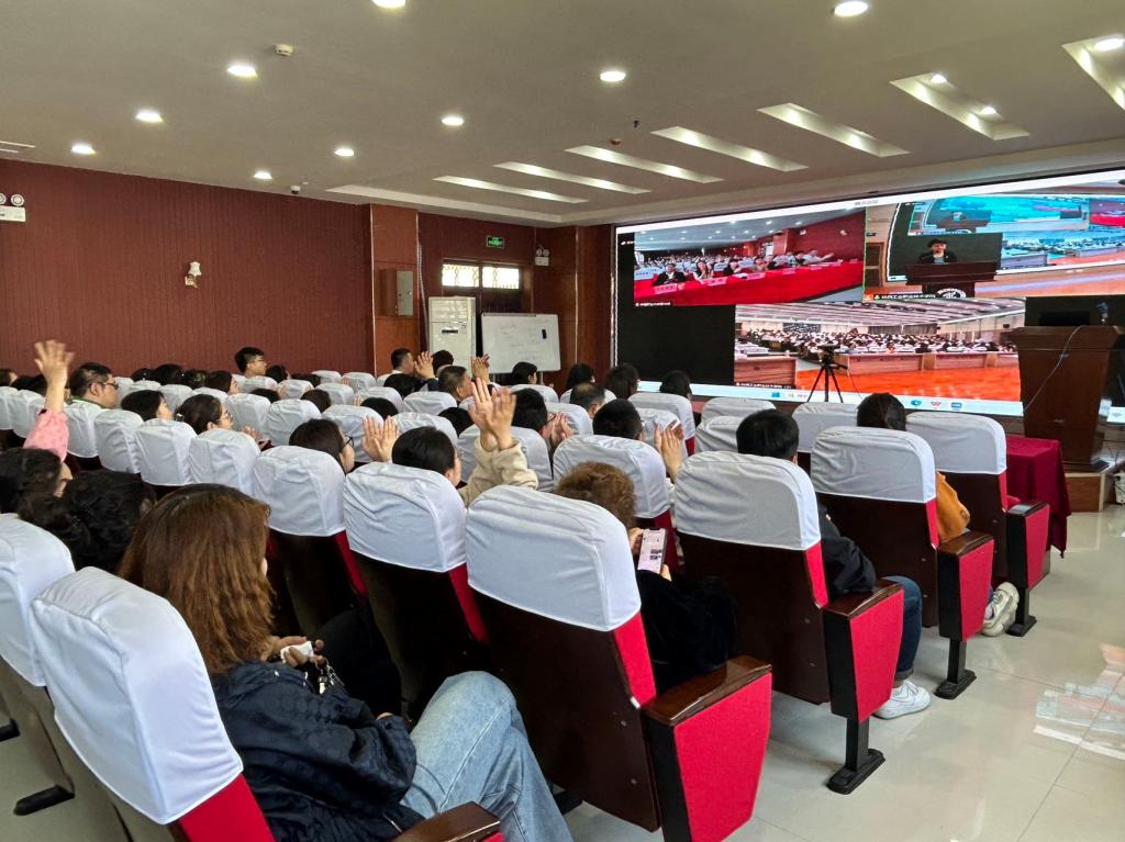 第一阶段为两校2024年“书香校园”读书文化节联合启动仪式,新疆职业大学校党委常委、统战部部长游海丽教授,我校校党委委员、副书记贺天柱教授,以及两校图书馆和各职能部室负责人、教职工代表、学生代表600余人现场参会。会议由我校图书馆馆长王丁主持。