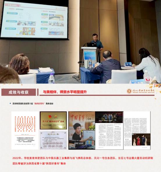 同日下午,美育改革创新案例报告会上,我校美育部部长付胜利以《“红色匠心”视域下高职院校“七炼融合”美育师资团队建设的创新与实践——以陕西工业职业技术学院为例》为题,从师德锤炼、课堂修炼、青蓝砺炼、研创淬炼、实践锻炼、内外合炼、机制熔炼七个方面展示了学校美育师资建设的成果,受到与会专家的充分肯定,获得高校美育改革创新优秀案例一等奖。近年来,我校重视美育师资团队建设,美育师资队伍2022年被评为陕西省第十届“陕西好集体”,并被《中国青年》杂志专版报道。