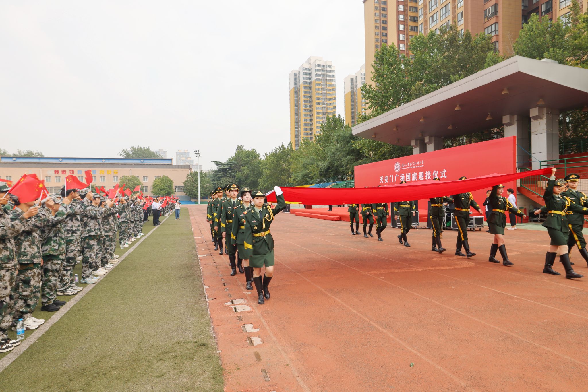 迎接仪式在雄壮的国歌声中拉开序幕。在全场师生瞩目下,党委副书记、校长刘永亮郑重地将天安门地区管理委员会赠予我校的天安门广场国旗转交给国旗护卫队。国旗护卫队队员迈着矫健的步伐,用整齐划一的动作将天安门广场国旗铺展开来,鲜艳的五星红旗在阳光的映照下熠熠生辉。全体师生挥动手中的“小国旗”,以“千面小国旗”迎请“天安门广场大国旗”,激越着满腔的崇敬与自豪。