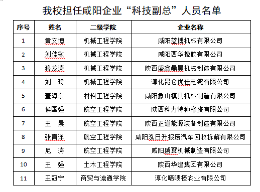 近日,中共咸阳市委组织部、市委科技工委印发《关于选派专家教授担任咸阳企业“科技副总”的通知》(咸科发〔2025〕21号),我校机械工程学院黄文博博士等11名科技工作者成功入选2025年咸阳市“科技副总”选派人员名单,将分别担任咸阳蓝博机械有限华体会、咸阳西华橡胶有限华体会等11家本地企业“科技副总”,助力企业破解技术研发、平台建设与人才培养等方面的难题。