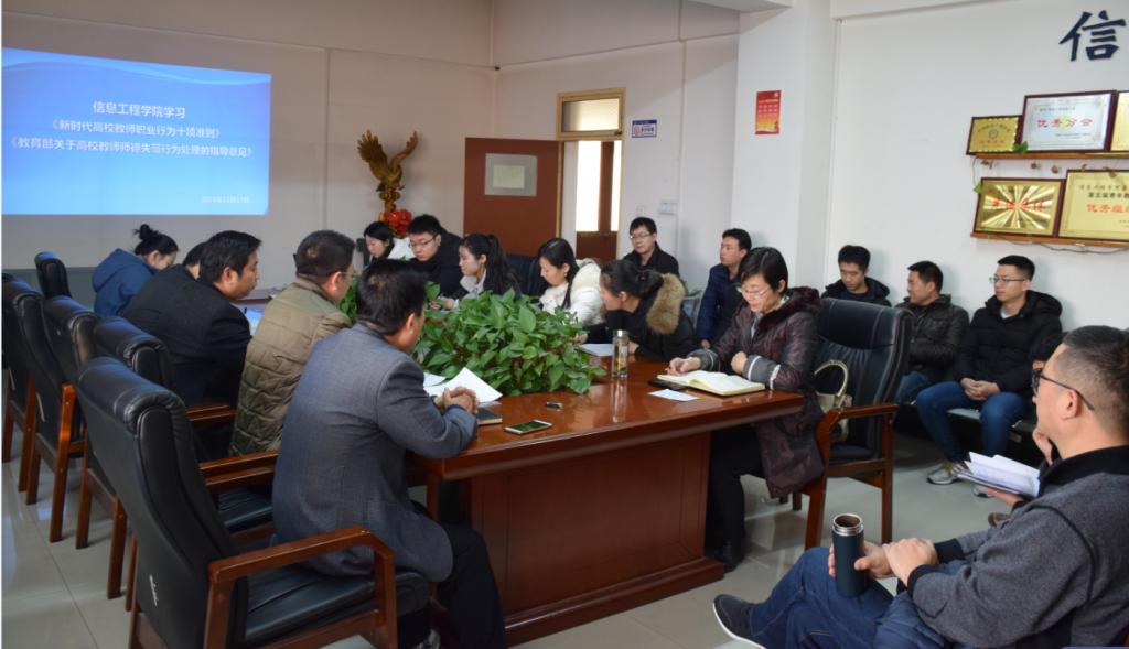 为全面落实全国教育大会精神,进一步加强师德师风建设,落实立德树人根本任务,12月17日下午,信息工程学院召开全体教师会议,组织学习《新时代高校教师职业行为十项准则》及《教育部关于高校教师师德失范行为处理的指导意见》,会议由信息学院院长何玉辉主持。