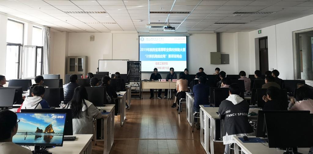 3月15日,2019年陕西省高等职业院校技能大赛“计算机网络应用”赛项说明会在我院精艺楼五楼召开,福建中锐网络股份有限华体会高级工程师王欢、姜勇,信息工程学院院长何玉辉、训练中心主任吕阿璐,以及来自全省18所院校的参赛师生参加了会议。会议由信息工程学院副院长殷锋社主持。