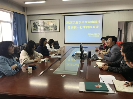 4月12日,东华大学出版社杜亚玲总编辑一行4人莅临化工与纺织服装学院,与化纺服装学院赵明威院长、贾格维书记及部分老师们进行了交流座谈,了解我院教师们的研究方向和研究现状,共同探讨专著出版及期刊论文的发展趋势。