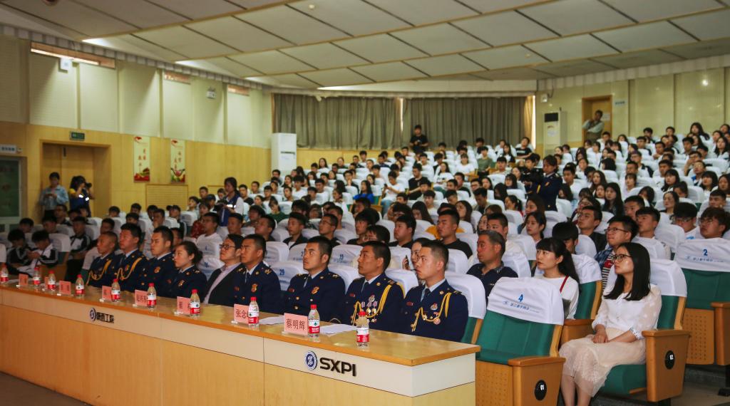 4月25日下午,由团委主办的纪念五四运动100周年“青春心向党,建功新时代”系列活动之“致敬逆行的青春”——消防事迹进校园分享会在学术会堂成功举行,咸阳市消防支队政治处副主任赵兴东,政治处组教科科长景璟出席活动,我院团委书记郝平、各二级学院团总支书记、辅导员老师及四百余名团员青年聆听了分享会。