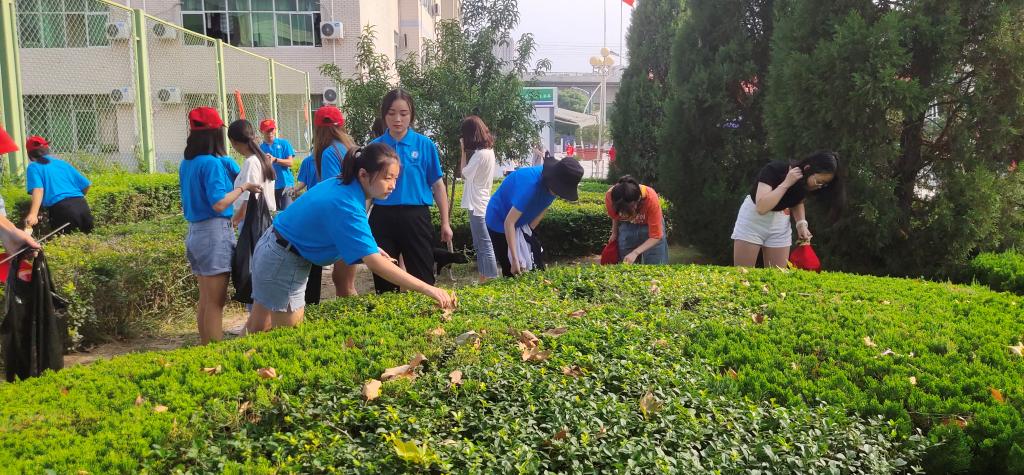 经过简单分工后,各班在指定区域内热火朝天地开始劳动,有的铲杂草、有的运杂物,有的清理绿化带内垃圾,有的擦除围栏灰尘,不放过任何死角。