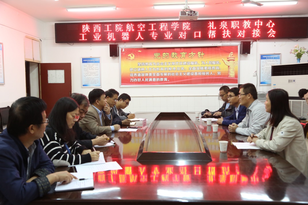 对接会上,礼泉职教中心杨建军校长对李晓鹏院长一行的到来表示欢迎。随后,李晓鹏院长对航空工程学院、工业机器人专业、实训条件及技能大赛情况进行了介绍;杨建军校长介绍了礼泉职教中心专业、师资。最后,在充分了解该校需求的基础上,双方就中高衔接工业机器人“3+2”人才培养、工业机器人人才培养方案、实验实训条件提升、大赛指导教师培养等方面进行了交流。航空学院按照“双百工程”结对帮扶任务,明确对方学校要求,确定了技能大赛教师培训、学生培训的方案和进度安排和预期目标,为后续对口帮扶工作开展打好基础。