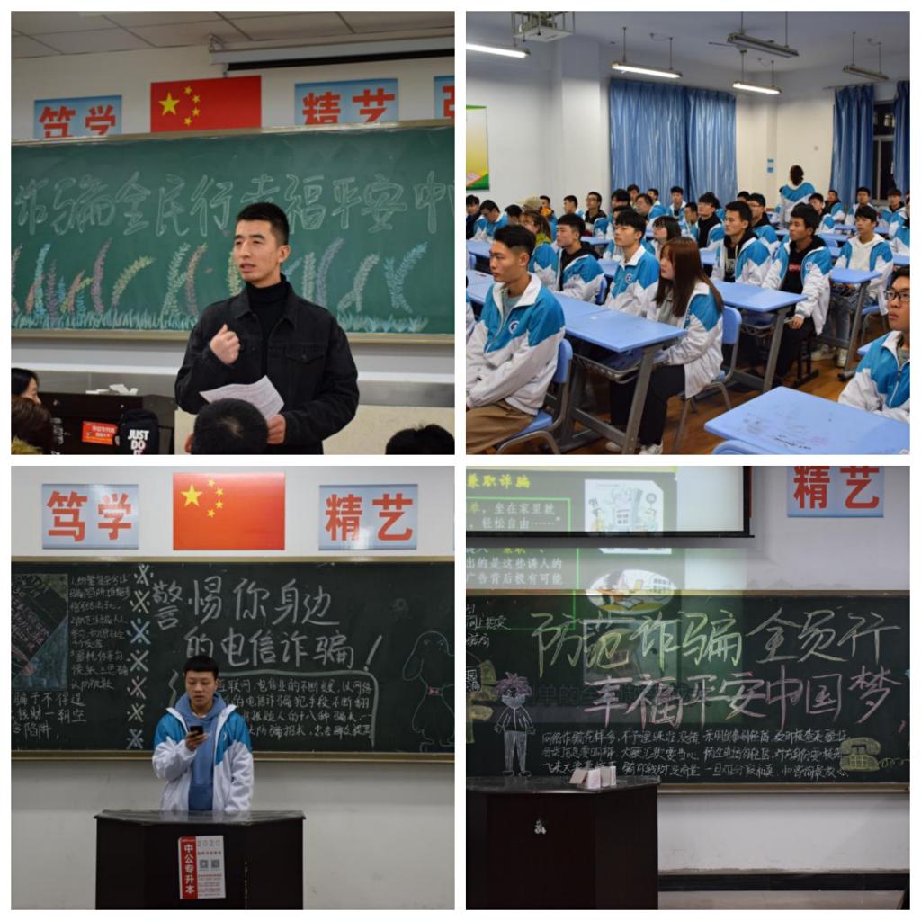 为了使同学们了解电信诈骗形式,增强学生自我防范意识,11月17日晚,信息学院利用晚自习时间组织各班级召开了防范电信网络诈骗主题班会。