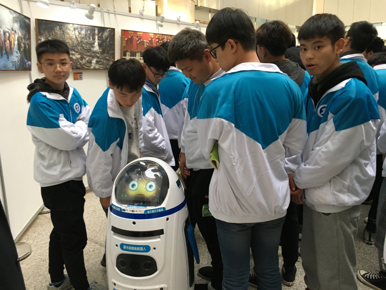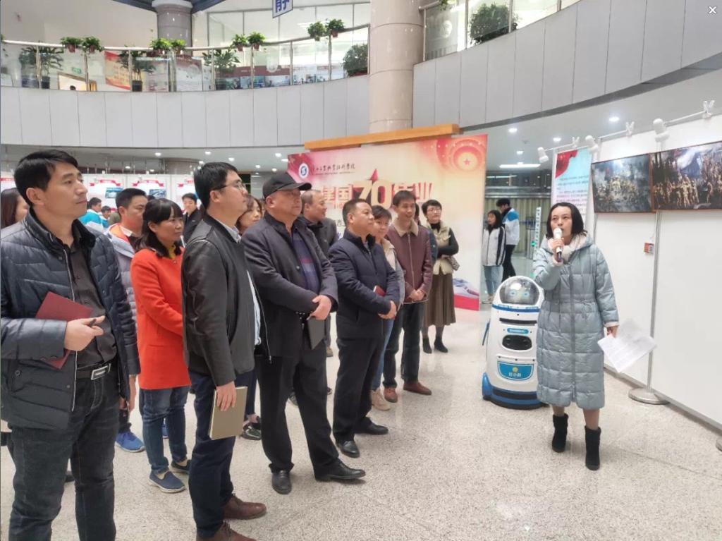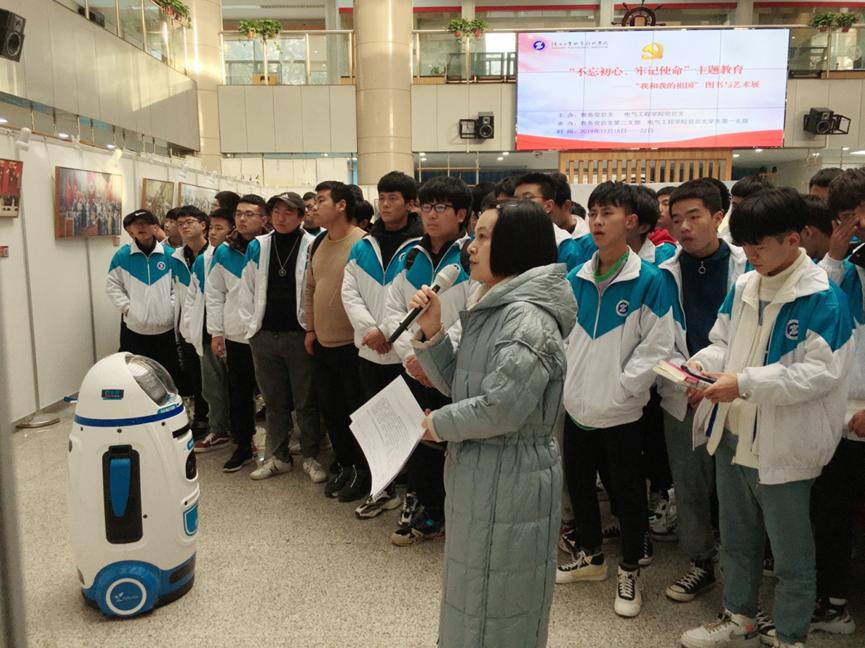师生们观赏党建知识专栏油画,或细读经典红色书籍,在缅怀革命精神的同时,提高了自身的文化内涵和政治素养。讲解员精彩细致生动的讲解赢得了师生阵阵掌声,同时会场上还辅助配备了智能AI机器人——“叮小胖”作为讲解员,师生们积极的与“叮小胖”交流互动,为艺术展增添科技感。