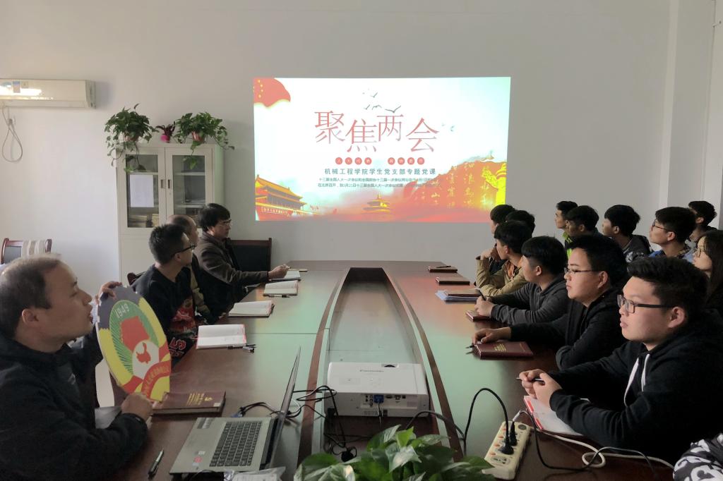 为进一步落实落细“三会一课”制度,把学习教育融入日常,3月21号下午机械学院学生党支部开展支部书记讲党课活动。支部书记徐军纪从微视频《誓言》导入,从两会知识我知道、两会看点我知晓、两会热词我了解、两会精神我学习等四个方面对全国两会进行了全面“聚焦”,支部党员就学习“两会”内容和精神的感想与心得进行了专题交流研讨。