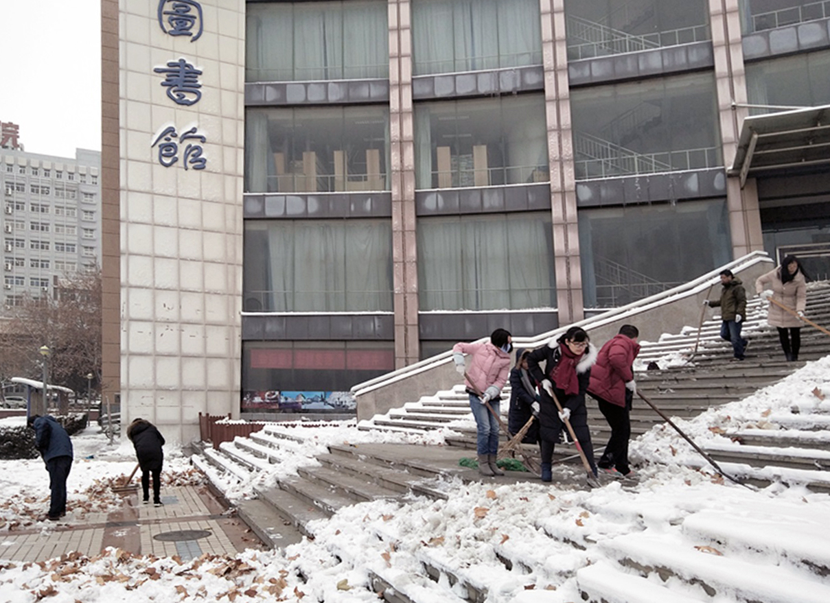 1月4日一大早,积雪已达十公分,为了避免来馆读者滑到,在党员同志们带领下,馆里的职工开展了热情高涨的清扫积雪活动。大家拿起铁锨、扫把清扫积雪,在零下的低温中地面湿滑扫雪工作异常艰难,但是,这丝毫没有影响大家的热情和工作效率。经过奋战,大家团结协作,发扬吃苦耐劳、顽强拼搏的战斗精神,将图书馆门前台阶、学术会堂门口及图书馆前广场大部分冰雪铲除,为读者开辟了宽阔的暖心通道。