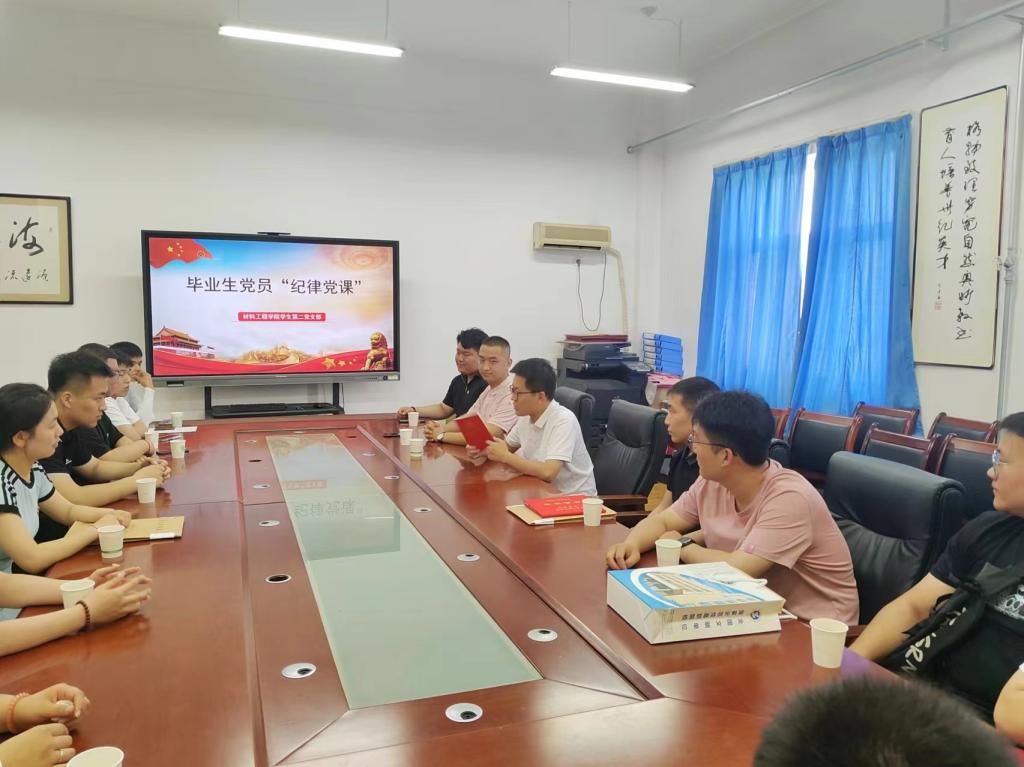 为深入贯彻习近平总书记关于党纪学习教育的重要讲话和指示精神,加强毕业生党员离校教育,强化纪律意识,以挺膺担当的姿态奔赴新的工作岗位。材料学院学生第二党支部于7月2日下午在行知E511会议室开展毕业生党员“纪律党课”教育活动,参与本次活动的有材料学院学生第二党支部书记赵盼盼以及材料学院全体毕业生党员。