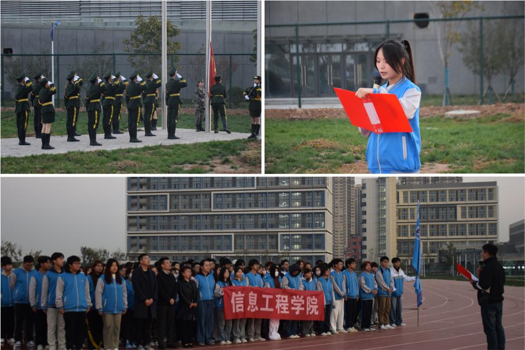 为落实资助育人实效,激励学生自立自强,勤学奋进,深入开展励志教育和感恩教育,10月28日清晨,信息学院师生代表举行了主题为“感恩资助 筑梦前行”的国旗下成长主题教育活动。信息学院党总支王伟、党总支副书记郭新玲、学工办主任赵松、2024级辅导员和学生代表参加了此次活动。