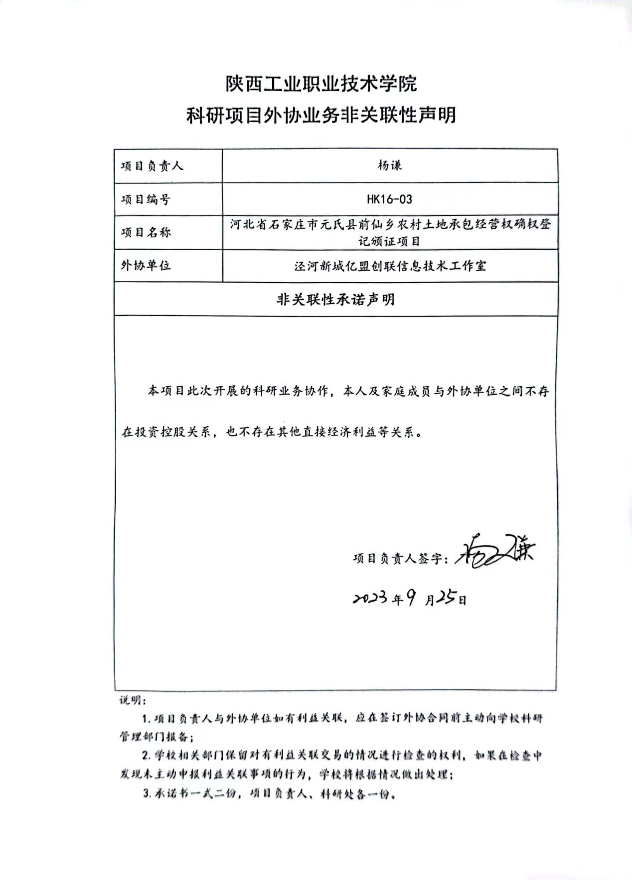 我院土木工程学院杨谦老师科研团队承担的横向课题“河北省石家庄市元氏县前仙乡农村土地承包经营权确权登记颁证项目”(项目编号HK16-03),部分工作内容拟申请第三方华体会进行合作研究(包括项目区卫星遥感影像正射处理,确权登记数据库的建设等信息技术服务)。按照《陕西工业职业技术学院横向科研项目及经费管理办法(试行)》(陕工院院字(2020)32号)文件规定,本次外协经费未超过横向合同总经费40%,现将信息公示如下。