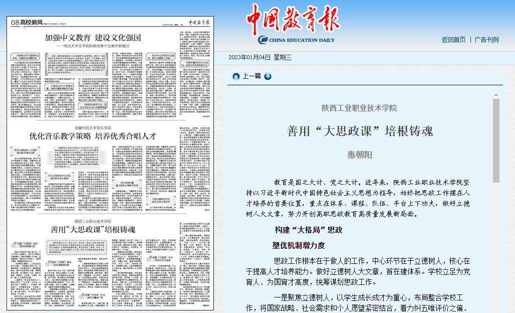 教育是国之大计、党之大计。近年来,陕西工业职业技术学院坚持以习近平新时代中国特色社会主义思想为指导,始终把思政工作摆在人才培养的首要位置,重点在体系、课程、队伍、平台上下功夫,做好立德树人大文章,努力开创高职思政教育高质量发展新局面。