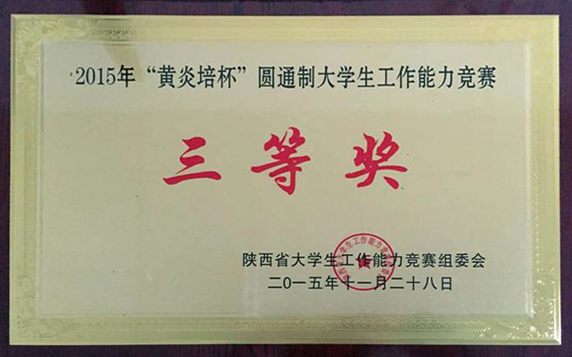 11月28日,2015年陕西省“黄炎培杯”圆通制大学生工作能力竞赛总决赛在西安举行。我院工商管理学院选派了会计1401班杨文乐、贺美玲、柏婉婷等同学组成的五人参赛团队(指导教师:杨红)首次参加该赛事,取得了团体三等奖1项,个人三等奖1项的优异成绩,杨红同志还被评为“优秀指导师”。