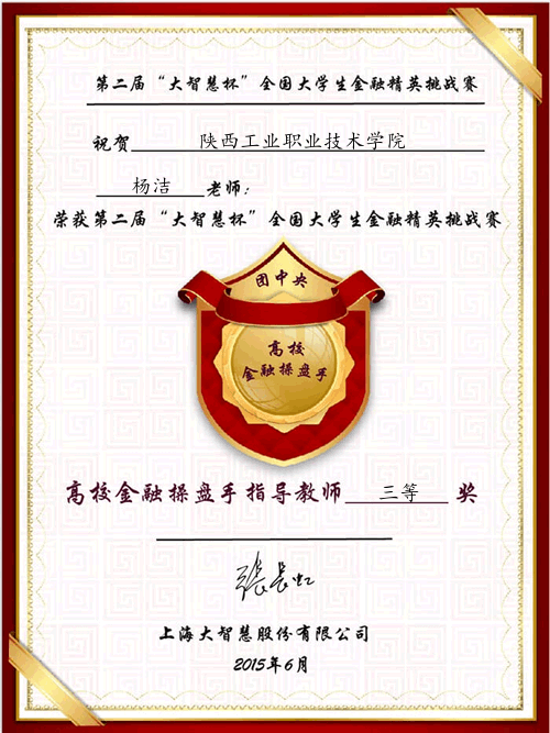 日前,我院学生参加了由共青团中央学校部、全国学联秘书处主办,上海大智慧股份有限华体会承办的第二届“大智慧杯”全国大学生金融精英挑战赛。比赛分为预赛、复赛两个阶段。参赛团队使用大赛专用平台,以A股、港股、股指期货三个投资品类进行投资策略比拼。经过几个月的投资交易,我院学生吴江波和隽林飞喜获大赛三等奖,指导教师杨洁获高校金融操盘手指导教师三等奖。