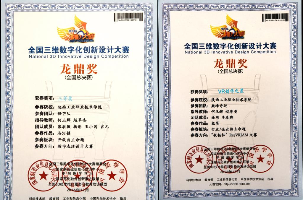 12月8日至12日,2016年第九届全国三维数字化创新设计大赛全国现场总决赛在江苏常州举行,我院信息工程学院教师赵革委、何玉辉指导的图形图像制作专业1404班学生张敏敏、杨彤等同学制作的三维漫游作品《洛河镇》获得“数字化表现设计”大赛全国三等奖。图形图像1504班徐周、1501班李春晓同学参加首届“锐扬杯”RayVR JAM大赛并获得“VR创作之星”奖。