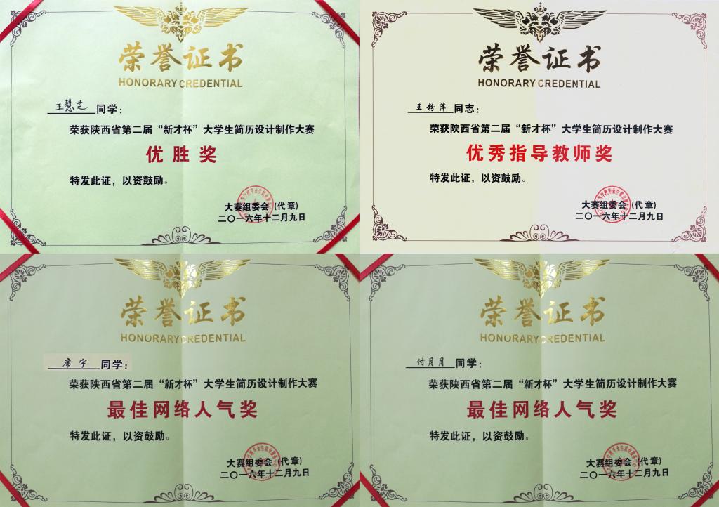 12月9日下午,由陕西省教育厅主办,陕西省高等学校毕业生就业服务中心、西北农林科技大学就业指导中心、211校招网承办的陕西省第二届“新才杯”大学生简历设计制作大赛总决赛暨颁奖典礼在杨凌举行,我院物流管理学院王慧芝同学和来自西安交通大学、西北农林科技大学、西北大学等12所高校的15名选手参赛。经过VCR视频展示和个人简历陈述等环节,荣获优胜奖,我院也获得“最佳组织单位奖”。另外,材料工程学院席宇同学荣获“最佳网络人气奖”,工商管理学院付月月荣获“最佳网络人气奖”,物流管理学院王粉萍老师荣获“优秀指导教师奖”。