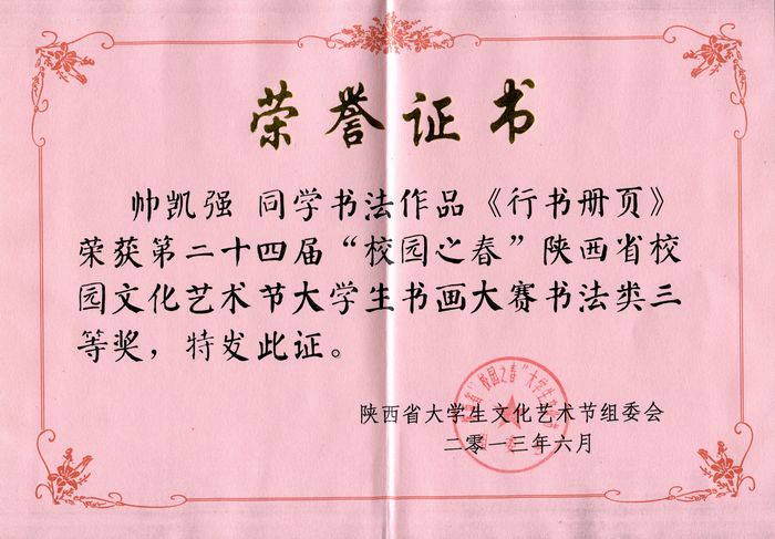 近日,由中共陕西省委教育工委、共青团陕西省委员会、陕西省学生联合会主办的第24届“校园之春” 陕西省大学生文化艺术节书画大赛在咸阳师范学院举行,包括我院在内的全省27所高校选派作品参加。我院帅凯强同学的作品《行书册页》、张晶同学的作品《笔近书随》荣获三等奖,展示了我院学生良好的文化素质。