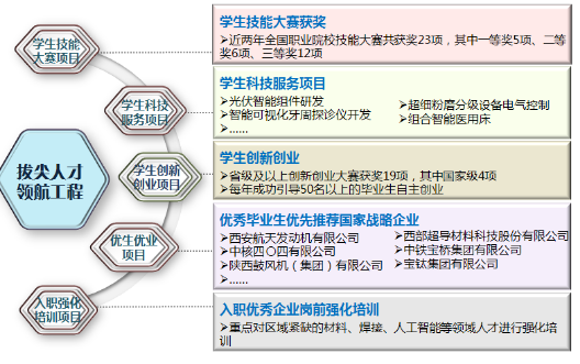 主动对接高端企业,围绕企业高素质技术技能人才需求,校企联手对专业综合排名前15%的学生进行重点培养。启动优秀学生技能大赛引领计划,保障优秀学生至少参加1项技能大赛;每年投入80万元,重点支持20个学生科技创新和大学生创新创业项目,不断提升学生实践创新能力;通过优先推荐优秀毕业生到西安航天发动机有限华体会、三星等企业就业,优秀毕业生入职前强化培训等措施,提升了毕业生的实践能力和职业竞争力。每年成功入职国家战略型企业和世界一流企业的毕业生以实践能力强、工作上手快、综合素质高深受企业的普遍好评。