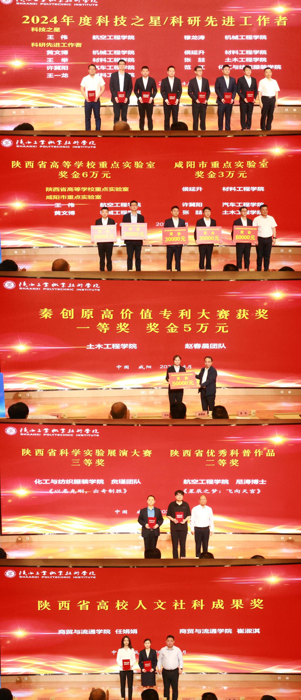 接着,对我校2024年度科技之星和科研先进工作者、获批立项的陕西省高校重点实验室和咸阳市重点实验室负责人、秦创原高价值专利大赛获奖团队、陕西省科学实验展演大赛获奖团队、陕西省优秀科普作品获得者及陕西省高校人文社科成果奖获得者分别进行表彰。