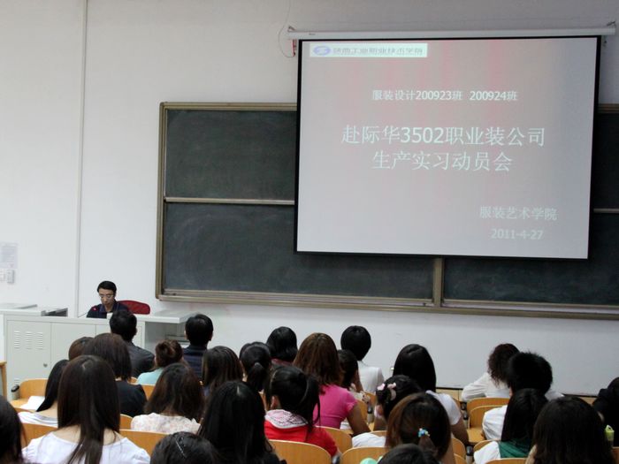 动员大会上,际华集团3502职业装有限华体会领导对华体会的光荣传统、雄厚实力和宏伟蓝图作了介绍。服装艺术学院领导对实习教学做了详尽的安排,并就安全工作提出了具体要求,实习学生代表做了表态发言。随后,服装学院领导将院旗授予实习班级班长,要求同学们在企业实习期间通过自己的表现,充分展现陕西工院学子的精神风貌。
