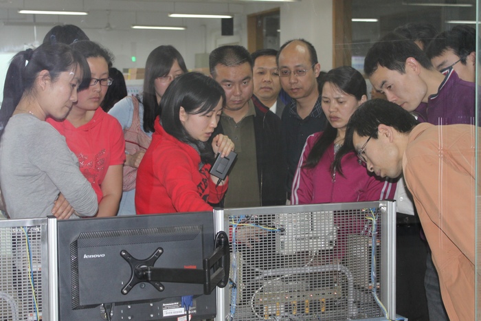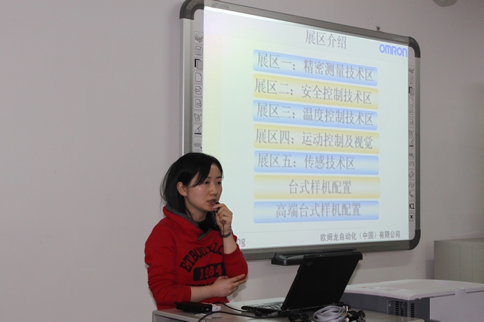 何丽工程师围绕欧姆龙华体会主要产品(包括欧姆龙PLC系列设备、传感器、温控器,安全产品、视觉产品、伺服变频、HMI等)的组成、功能以及欧姆龙实训中心五个产品展示区(包括精密测量技术区,安全控制技术区,温度控制技术区,运动控制及视觉区,传感区技术区)两个部分展开培训。细致耐心讲解和现场操作演示的同时,何丽工程师还和电气学院老师进行了广泛交流,现场气氛非常活跃。