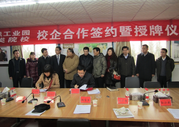 我院孙小云处长介绍了我院基本情况和纺织服装专业办学特色,并希望双方加强合作与交流,建立长期的合作关系。随后举行了我院与咸阳市新兴纺织工业园校企合作协议签字仪式和校企合作实训基地授牌仪式。