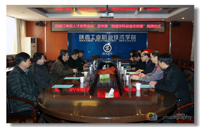1月2日下午,我院与西北医疗器械(集团)有限华体会“西诺”订单班人才培养协议签字暨“西诺牙科设备实训室”揭牌仪式在崇文南楼第一会议室举行。西北医疗器械(集团)有限华体会总经理李爱国、营销总监窦波、总经办主任聂西社、技术部副经理魏小峰、手机事业部制造部经理何林昌、总装车间主任刘登峰和我院院长崔岩、副院长王晓江、教务处、数控工程学院相关负责同志出席,王晓江副院长主持仪式。