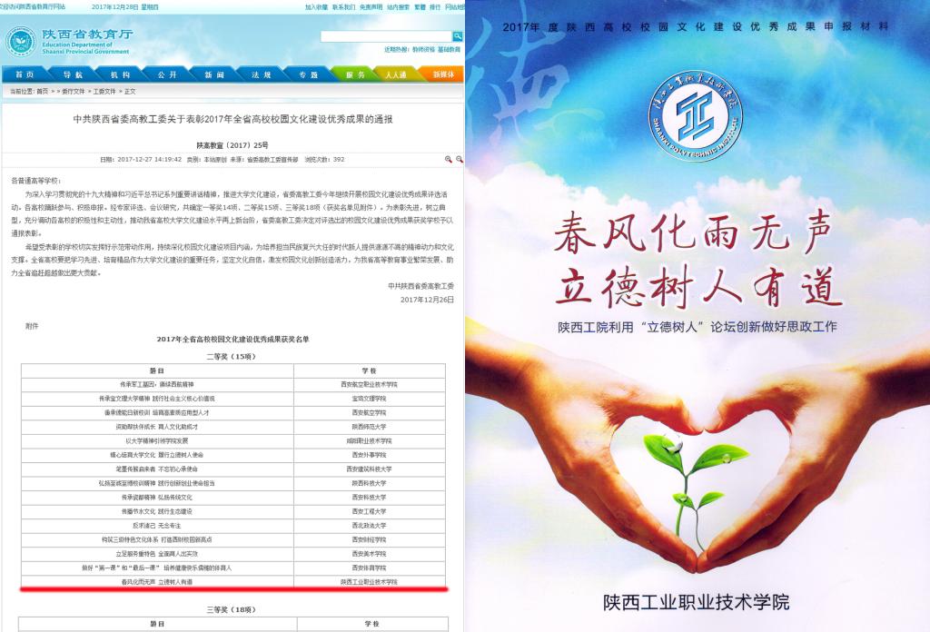 12月26日,省委高教工委公布2017年全省校园文化建设优秀成果的表彰决定,我院宣传部申报的《春风化雨无声、立德树人有道——陕西工院连续五年利用“立德树人”论坛创新做好思政工作》的文化建设成果获二等奖,这也是我院连续九年获得奖项。目前,我院共有“全国高校校园文化建设优秀成果奖”二等奖1项,“陕西省校园文化建设优秀成果奖”一等奖4项、二等奖5项。