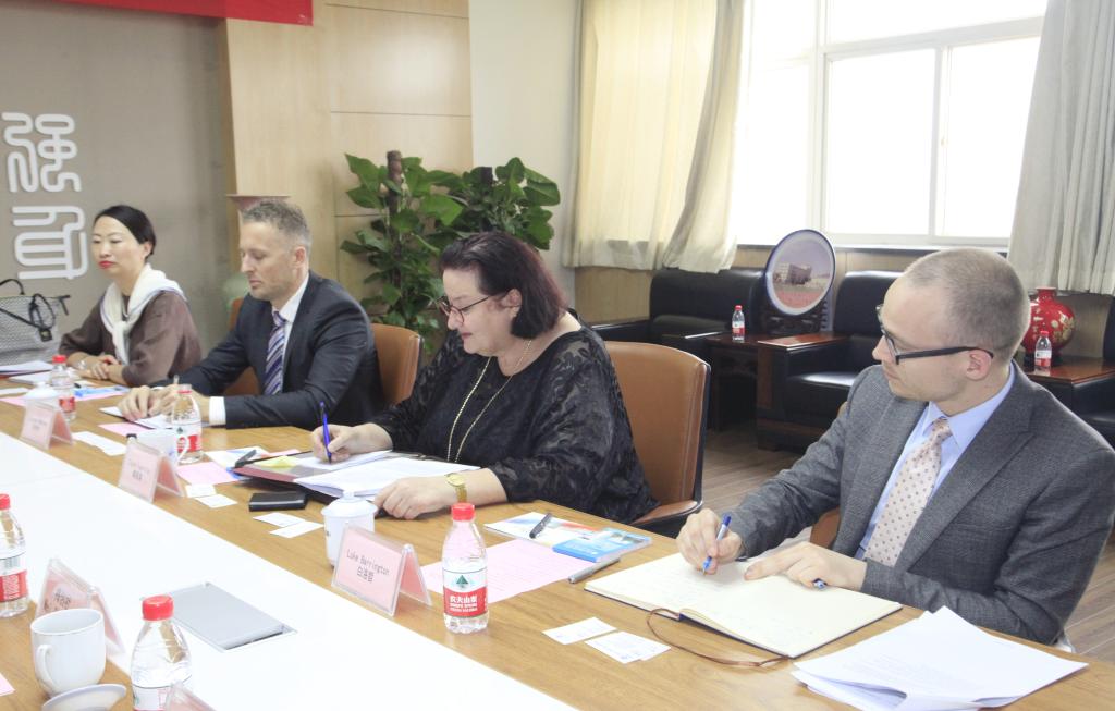 惠朝阳书记代表全校2万余名师生向傅恩莱大使一行莅临访问表示热烈欢迎。在介绍了学院基本情况和近年来在标志性教学成果、主要办学指标和国际交流合作等方面取得的成绩后,他表示,新西兰职业教育发达,在世界享有盛誉,近年来我院与新西兰合作院校开展的交流合作项目有力地促进了学院的内涵建设,提升了国际影响力。在我院争创中国特色高水平高职院校和专业群的重要时刻,傅恩莱大使的访问对进一步促进我院与新西兰的教育交流合作是一个重要的契机,对推进落户我院的中国-新西兰职业教育示范项目教师培训基地工作具有重要意义。随后,他从举办国际会议、开发微型工程证书、举办职教法讲座、选派骨干教师赴新西兰培训、开展职教课题研究等方面,向傅恩莱大使汇报了中国-新西兰职业教育示范项目教师培训基地的工作设想,并希望新西兰驻华大使馆为我院在合作办学、推荐新西兰青年来校交流学习方面牵线搭桥,提供支持和帮助。