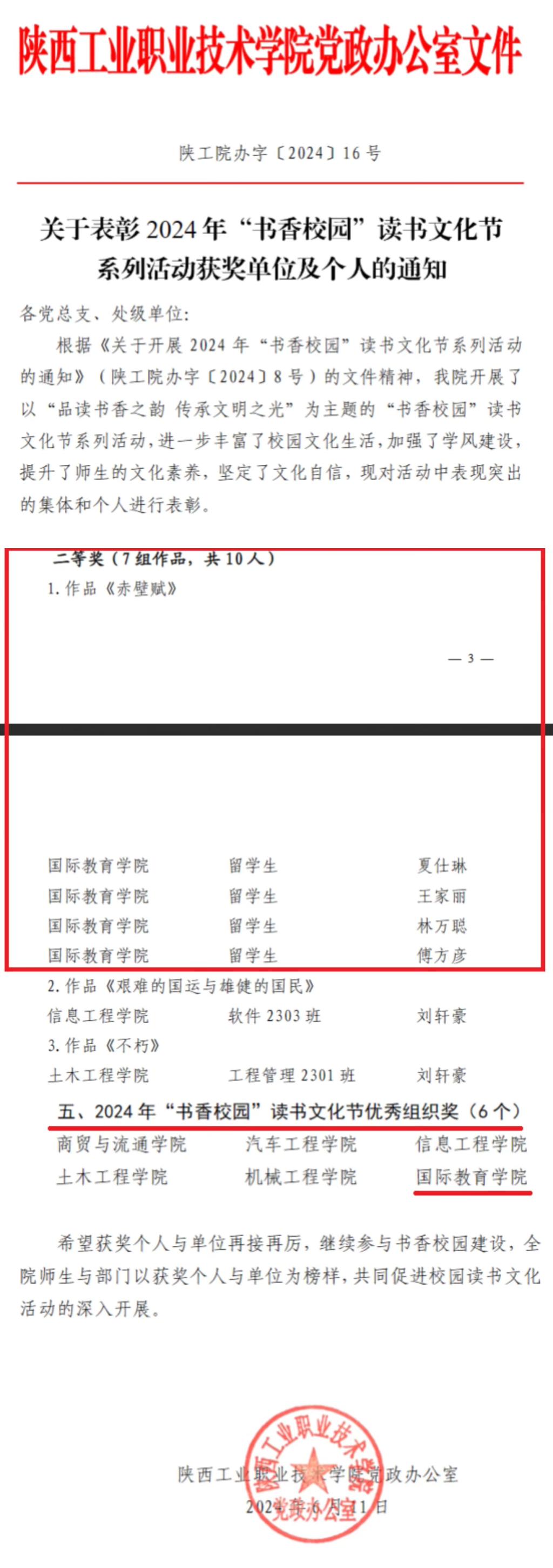 留学生在2024年“书香校园”读书文化节系列活动中获奖