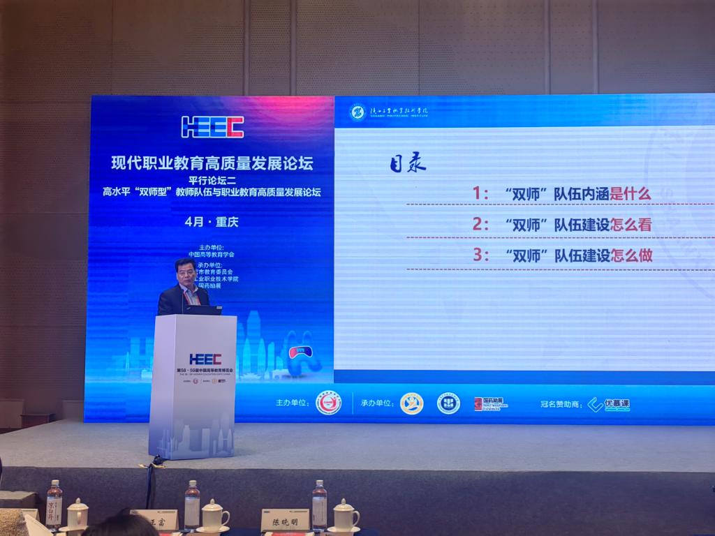 作为第58·59届中国高等教育博览会的主论坛之一,高水平“双师型”教师队伍与职业教育高质量发展论坛在重庆市悦来会议中心欣悦厅B举行。本次论坛以“打造‘双师’新范式 校企协同促发展”为主题,中国高等教育学会副会长、江苏省政协教卫体委员会主任葛道凯,教育部职业教育与成人教育司副司长林宇,教育部教师工作司副司长翁波,重庆市委教育工委委员、市教委副主任李劲渝,机械工业教育发展中心主任、中国机械工业联合会教育培训部主任陈晓明等领导专家出席会议,市内外职业院校领导、企业领导、专家学者、院校教师代表、华体会(中国)媒体等3万余人通过线上线下方式参加论坛,共研高水平“双师型”教师队伍建设发展路径。本次论坛由中国高等教育学会主办,重庆工业职业技术学院、国药励展展览有限责任华体会等承办。