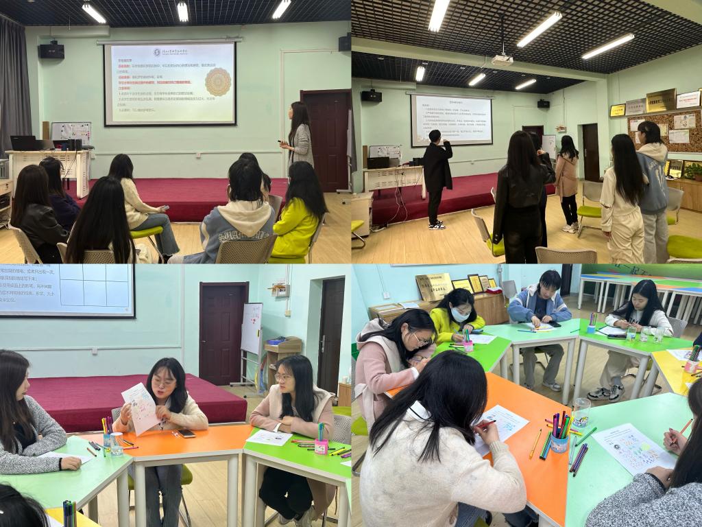 本次团体辅导活动由心理咨询中心专职教师张海与任雨睿带领开展。在活动开始前,由任雨睿老师详细介绍了开展本次团体辅导的目的以及注意事项。活动伊始,张海老师带领大家一起进行了“减压放松操”热身,本次团辅在老师们的阵阵欢笑中拉开了帷幕。接下来是“我演你猜”,各位老师对情绪的表演惟妙惟肖,在过程中用心感受着不同情绪带来的内心体验。“情绪九宫格”活动中,老师们对过去一周的情绪进行了回顾与绘制,汲取了充分的心理能量。在随后的“天使与恶魔”环节里,大家针对不同的情绪困扰事件展开了分享与讨论,现场氛围热烈而欢快。团辅活动的最后环节,每一位老师在温馨的冥想音乐中,用心绘制属于自己的“情绪曼陀罗”。