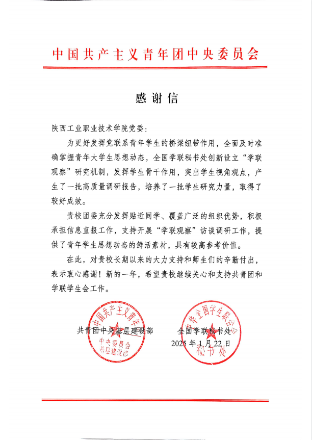 近日,共青团中央基层建设部、全国学联秘书处向陕西工业职业技术学院党委发来感谢信。对陕西工院团委、学生会长期以来充分发挥党联系青年学生的桥梁纽带作用表示衷心感谢。