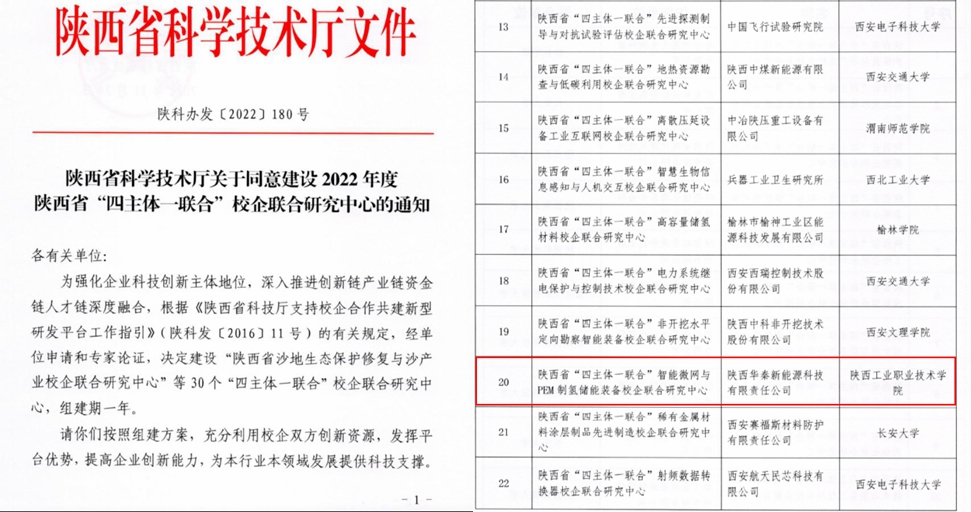 近日,陕西省科学技术厅发布了《陕西省科学技术厅关于同意建设2022年度陕西省“四主体一联合”校企联合研究中心的通知》(陕科办发[2022]180号),由我校与陕西华秦新能源科技有限责任华体会联合共建的“智能微网与PEM制氢储能装备校企联合研究中心”获批建设陕西省“四主体一联合”校企联合研究中心,全省共获批30个研究中心,我校也是唯一获此平台的高职院校。