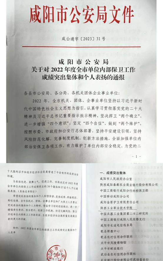 近日,我校先后被咸阳市公安局和咸阳市公安局渭城分局分别评为 “2022年度全市单位内部保卫工作成绩突出集体”和“2022年度经文保系统治安管理目标责任考核先进集体”称号;同时,保卫处处长胡建辉同志被咸阳市公安局渭城分局授予“2022年度渭城区经文保系统治安管理目标责任考核先进个人”称号。