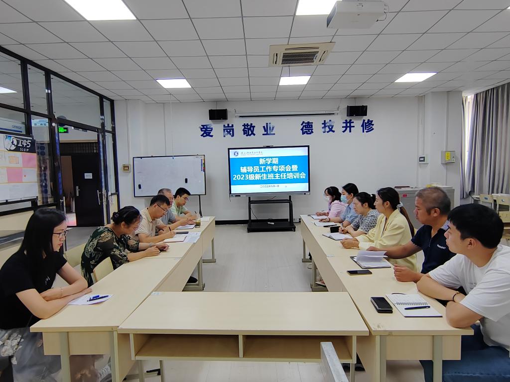 新学期伊始,为确保各项学生工作安全有序高效开展,9月1日上午,电气学院在行知楼A欧姆龙教室组织召开新学期辅导员工作专项会暨新生班主任培训会,电气学院党总支书记韩伟、学工办主任赵松、学工办全体辅导员以及2023级新生班主任参加会议。