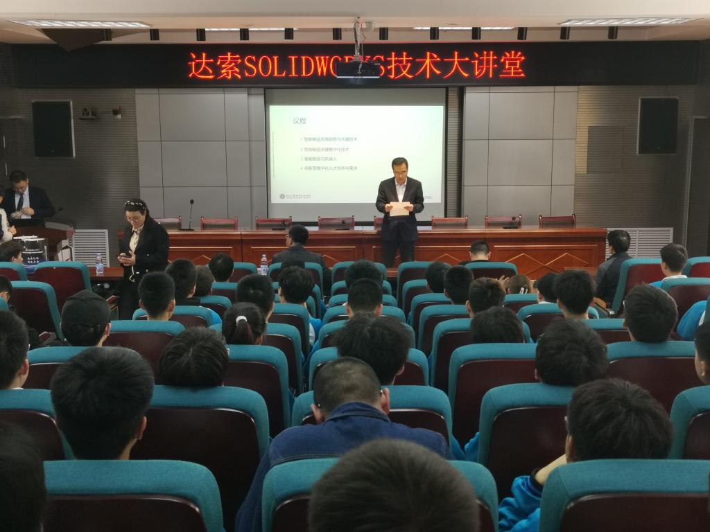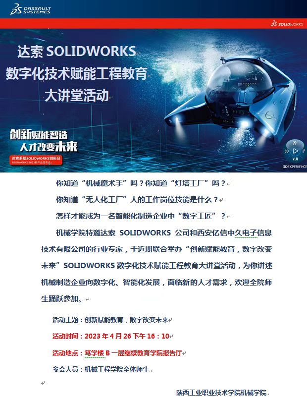 为进一步学习和领会党的二十大报告中关于“实施科教兴国战略”的内容,增进同学们对制造业未来发展趋势的了解,普及数字化智能化生产概念,制定符合行业发展需要的职业规划,立志成为社会主义现代化国家的建设者和践行者,4月26日下午,机械工程学院党总支特邀达索SOLIDWORKS华体会大中国区教育资深顾问王天虎和西安亿信中久电子信息技术有限华体会总经理陈阳在笃学楼B一层继续教育学院报告厅开展主题为“创新赋能教育,数字改变未来”文化大讲堂,机械学院党总支书记苏宏志、院长赵明威、教师代表、学生代表共120余人参加了讲座。