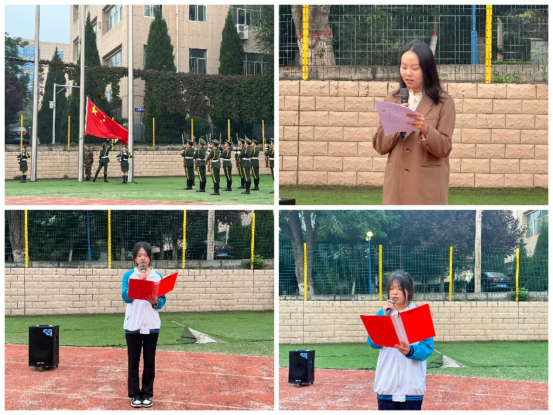 6点50分,升旗仪式正式开始。迎着初升的朝阳,国旗护卫队队员护送鲜艳的五星红旗走向升旗台,伴随着庄严的国歌声,五星红旗冉冉升起,全体师生昂首肃立,深怀对祖国无限的热爱和崇高的敬意,向国旗行注目礼。