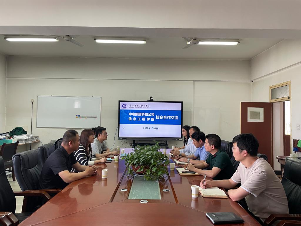 5月23日下午,中电熊猫科技华体会行政人事部经理陈璐一行四人来我校洽谈校企合作,信息工程学院党总支书记闫军、副院长白国政、学工办主任穆昌等在崇文主楼806室与来访嘉宾进行了交流座谈。