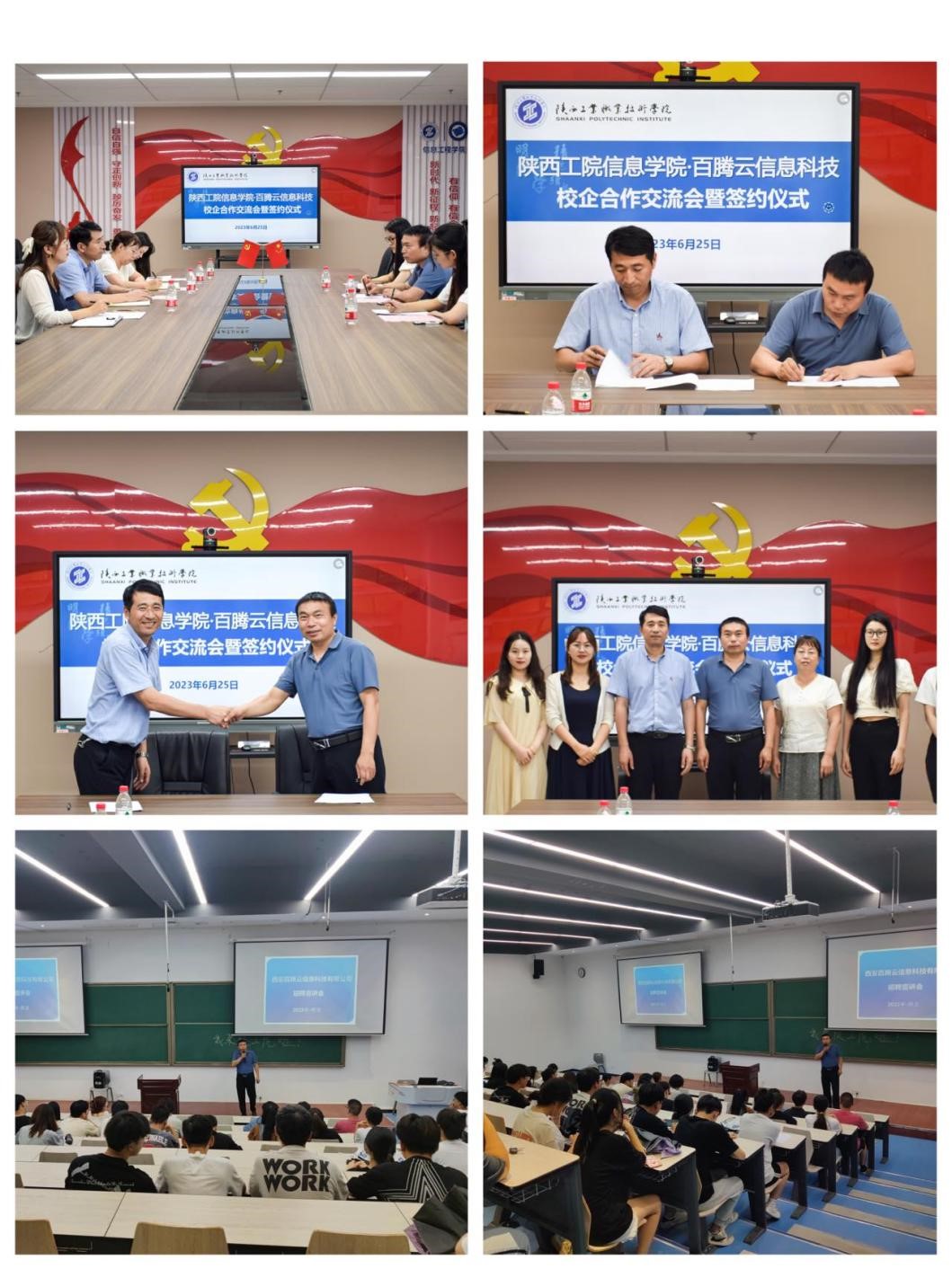 西安百腾云信息科技有限华体会总经理汤中美对我院发展情况给予了高度评价,他从基本业务、运营模式、校企合作等方面介绍了企业基本情况,希望能同我院达成长期合作,互利共赢。随后,双方举行了签约仪式。