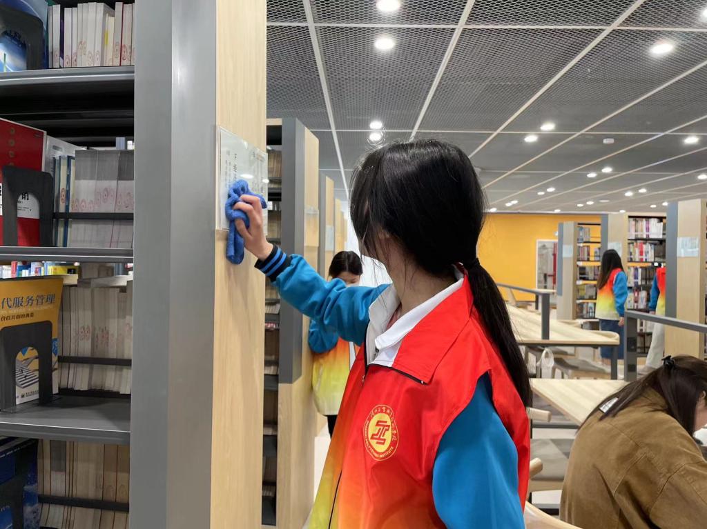 志愿者们分成三个小组,分别打扫图文信息中心2-4层公共借阅区域。大家在领到打扫工具后,积极踊跃、不畏脏、不怕累,分工明确,配合默契。