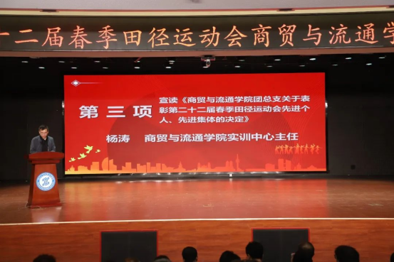 实训中心主任杨涛宣读了《商贸与流通学院团总支关于表彰第二十二届春季田径运动会先进个人、先进集体的决定》,学院领导和老师们依次为本次运动会涌现出的先进个人和先进班集体颁发了荣誉证书。随后七位学生代表依次上台发言。同学们表示,运动会期间虽然贡献了精力与汗水,但也学会了友爱、团结和理解,我们将继续前行,发扬商贸人的风采,一起做红心商贸人,干阳光流通事。