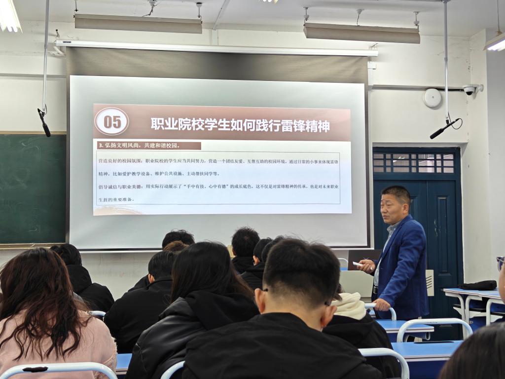 党课伊始,杨修国书记以雷锋的生平事迹为切入点,生动讲述了雷锋从一个贫苦孤儿成长为一名全心全意为人民服务的共产主义战士的历程。通过一个个真实鲜活的故事,让大家深刻感受到雷锋精神中蕴含的无私奉献、助人为乐和钉子精神。随后,杨修国书记从学习雷锋精神,树立正确价值观;积极参与志愿服务,传递温暖与爱心;弘扬文明风尚,共建和谐校园;发挥专业特长,服务社会发展等四方面阐释职业院校学生如何践行雷锋精神。