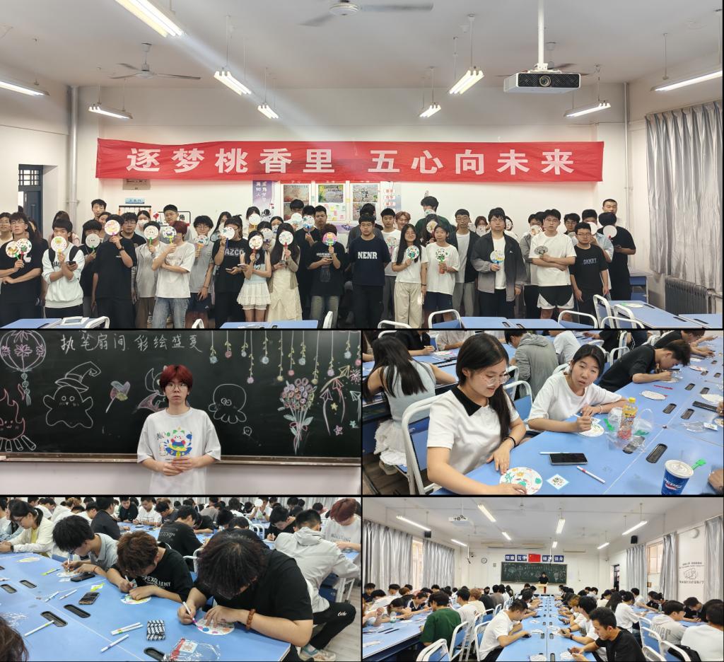 随后,同学们迫不及待地拿起画笔,在空白团扇上尽情挥洒创意。在绘制过程中,色彩的调和、线条的勾勒,都成为同学们释放压力、舒缓情绪的窗口。有的同学以花鸟为主题,展现出大自然的生机与美好;有的同学将现代元素融入团扇,充满个性的创作彰显青春风采;还有的同学以书法入扇,写下励志名言坚定内心信念。同学们相互交流、互相借鉴,现场热烈融洽的氛围,也为大家营造出了温暖、包容的心理环境,有效缓解了日常学习生活中的焦虑与疲惫。