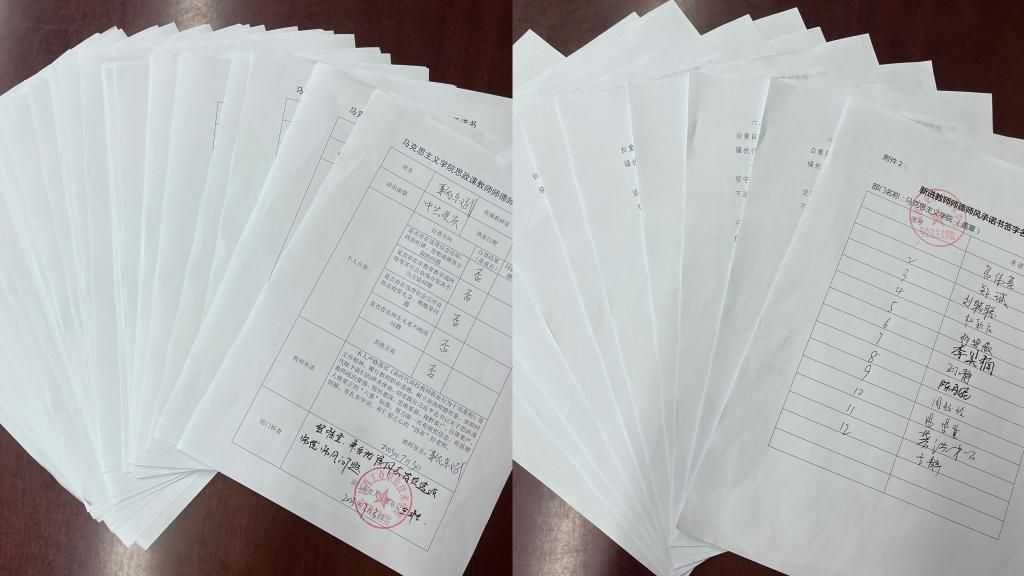 ——开展关键群体专项自查整治行动。围绕师德师风专项整治重点,制作“马克思主义学院思政课教师师德师风自查及承诺书”,组织全体新老师教师聚焦“是否存在违背信念信仰、政治纪律、思想道德等方面的问题;是否存在在教育教学或网络等其它公众场合发表不当言论问题;是否存在违背社会公序良俗及收受礼金、贿赂等问题;是否存在师生关系不纯洁问题”等方面,深入开展自查互查、部门核查并签名。组织2022年新进教师签署《师德师风承诺书》,督促教师树牢底线意识,加强道德修养与道德实践,自觉遵规守纪,做学生修炼品格的领路人。经摸底排查,未发现违反师德师风情况。