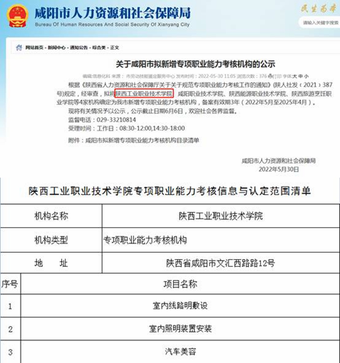 为贯彻落实国家职业资格制度改革,推动区域技能人才评价和规范专项职业能力考核工作,扩大服务社会业务范围和能力,助力区域经济发展,我校按照《陕西省人力资源和社会保障厅关于规范专项职业能力考核工作的通知》(陕人社函[2021]387号)和咸阳市人力资源和社会保障局《关于申报备案专项职业能力考核机构的通知》等文件安排,积极组织电气工程学院和汽车工程学院申报咸阳市专项职业能力考核机构,最终室内线路明敷设、室内照明装置安装和汽车美容等三个专项职业工种获得咸阳市人力资源和社会保障局公示通过。